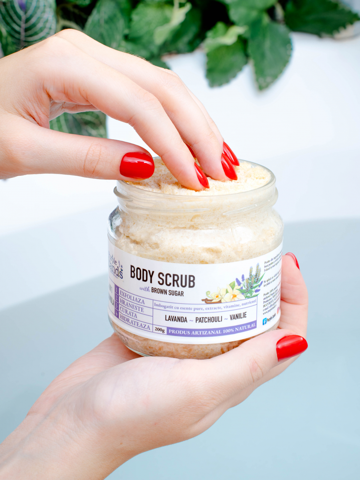 INGREDIENTE: Unt de Mango - Unt de Shea - Ulei de Cocos - Ulei de Avocado - Esenta Pura de Lavanda - Ulei esential de Patchouli - Extract de Vanilie - Zahar Brun