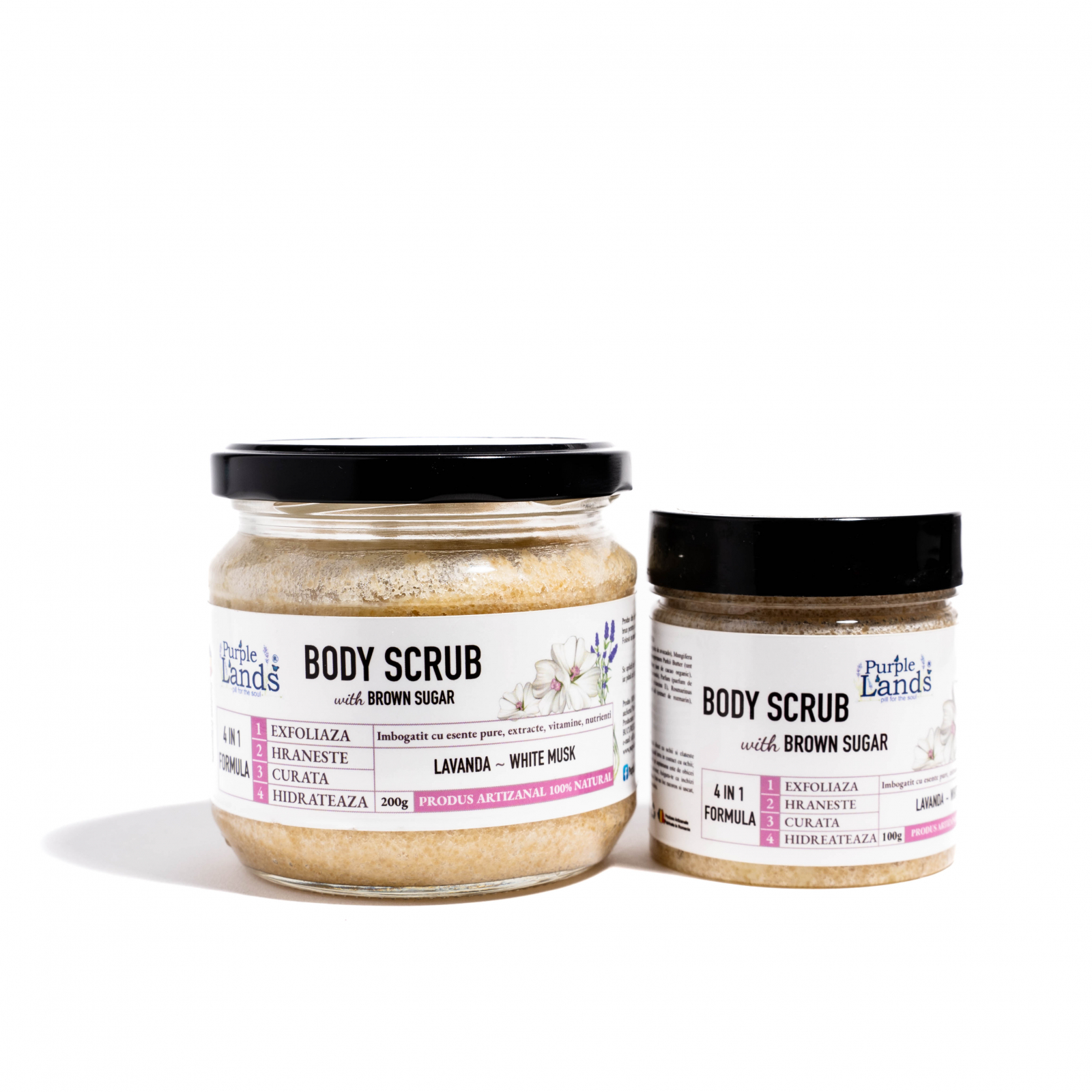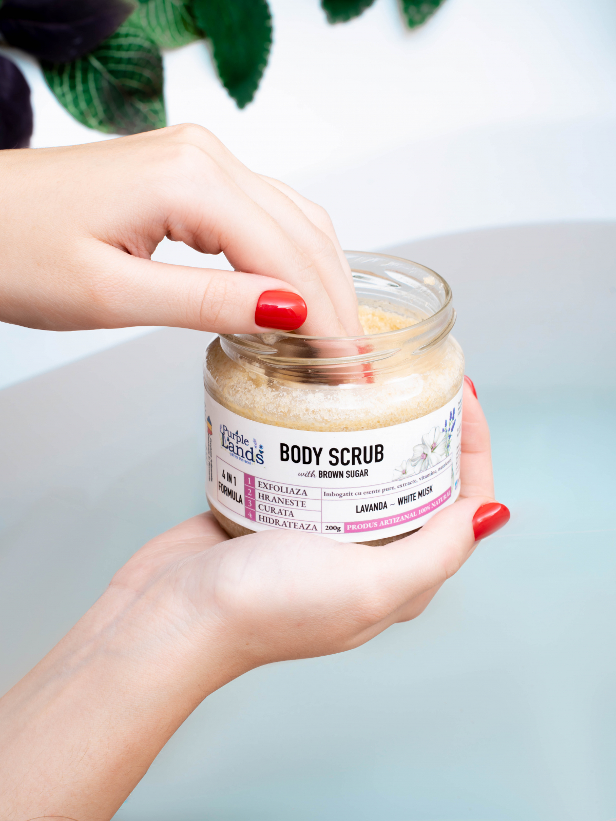INGREDIENTE: Unt de Mango - Unt de Shea - Ulei de Cocos - Ulei de Avocado - Esenta Pura de Lavanda - Extract de Mosk - Zahar Brun