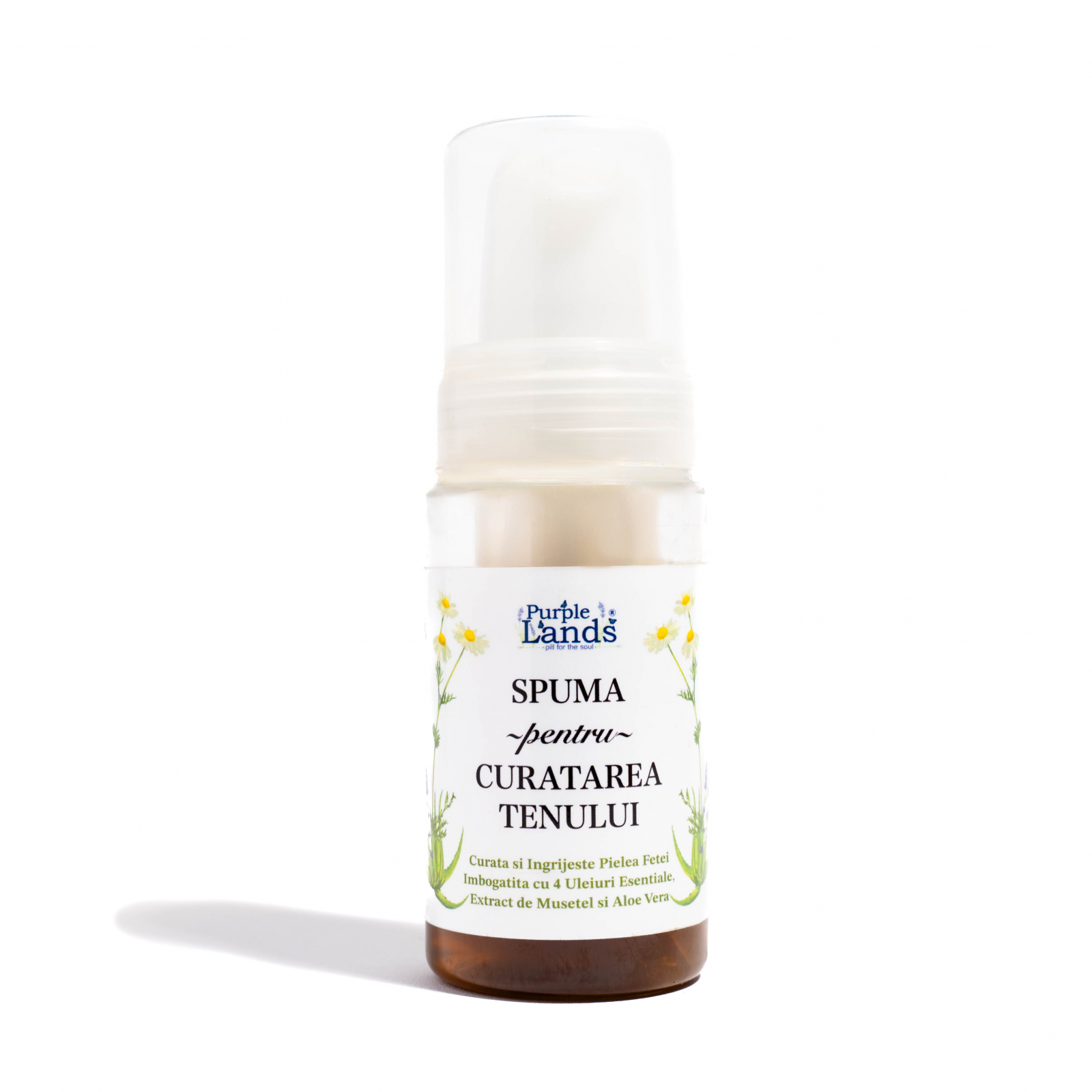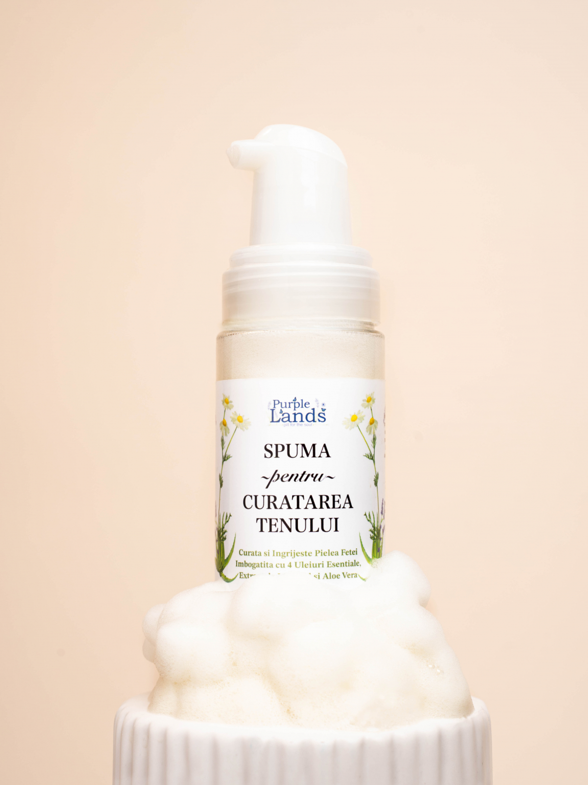 Descopera o spuma delicata pentru curatarea tenului, infuzata cu ingrediente naturale de cea mai inalta calitate. Formula noastra exclusiva include apa pur organica de lavanda, glicerina vegetala, uleiuri esentiale atent alese de menta, salvie, bergamota si lavanda, extract de rozmarin,extract de musetel si vitamina E. Aceasta combinatie armonioasa curata delicat pielea, oferind o experienta racoritoare si revigoranta. Transforma rutina zilnica de ingrijire a tenului intr-un moment de rasfat si prospetime naturala, conferind tenului tau o senzatie placuta si revitalizata. Fara ingrediente agresive, spuma noastra pentru curatarea tenului respecta natura delicata a pielii tale, lasand-o curata, catifelata si improspatata.